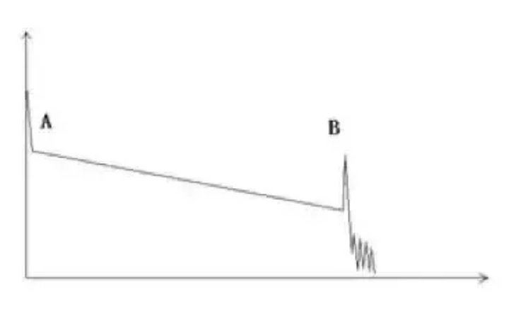 图中A为OTDR接口法兰盘反射峰,B为断纤断面造成的反射峰。